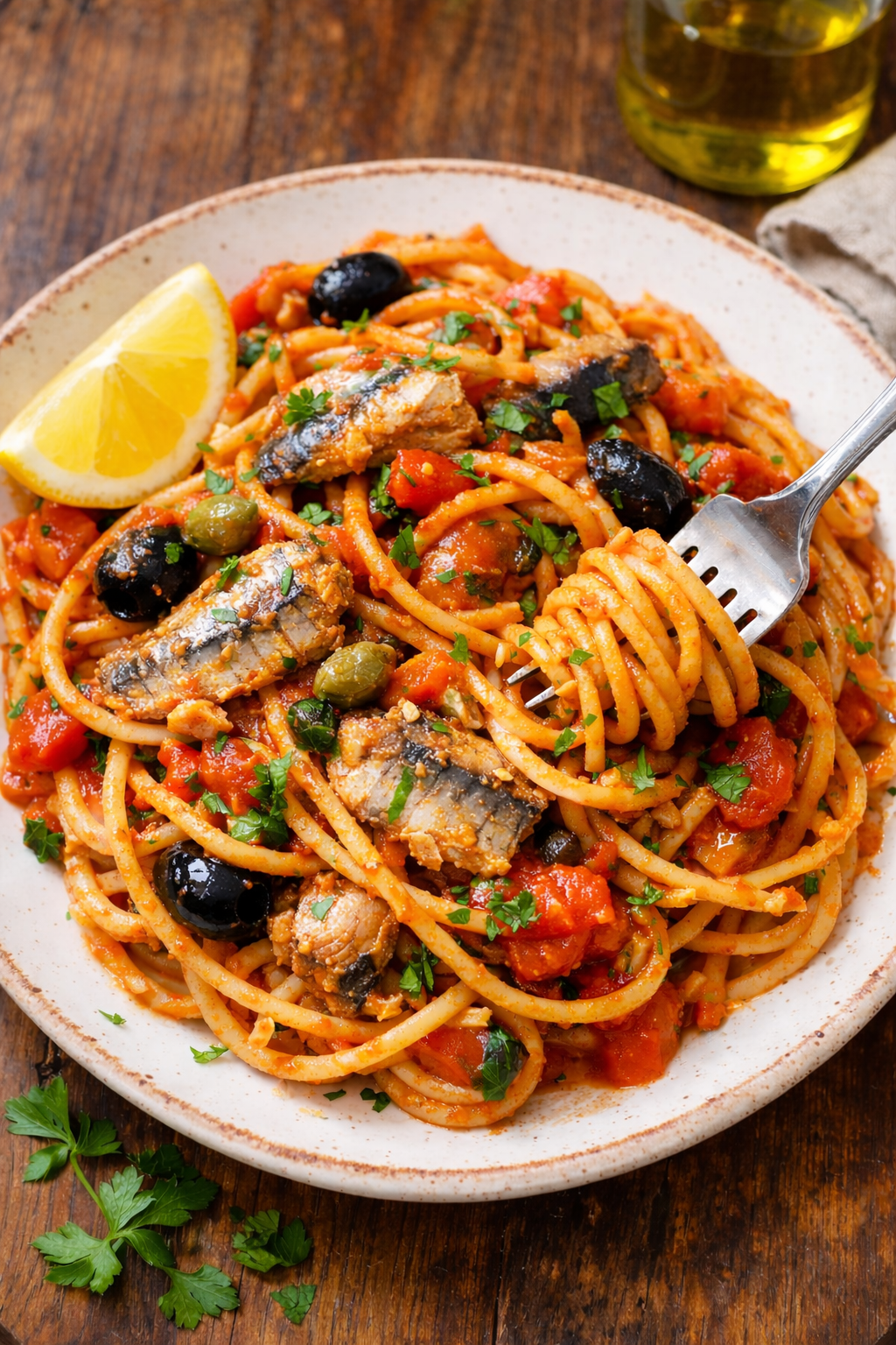 Ingredients: Whole-wheat pasta, olive oil, garlic, passata/tomato paste, capers/olives (optional), sardines (for Omega 3). Option to choose salmon over sardines.