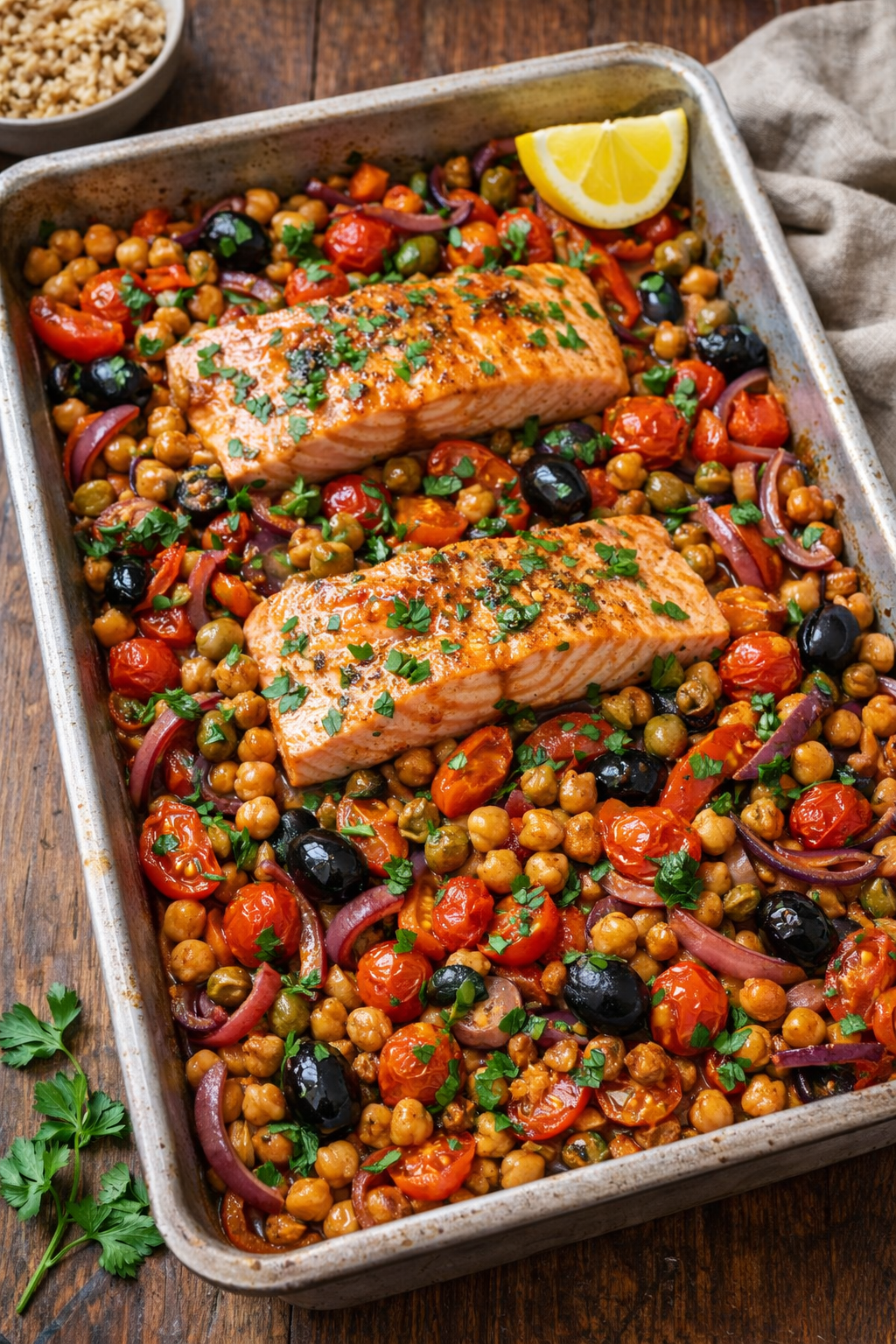 A Mediterranean chickpea and salmon tray Bake is a great one-pan combo meal for men trying to support prostate and urinary health through diet.